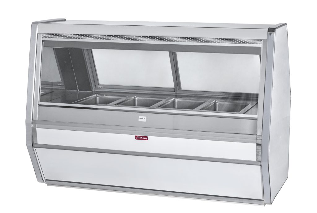 Designed for use in rows of 40E series service cases, the Howard McCray CHS40E-6 full service heated display case has removable end panels. It features five individually controlled wells, each with a separate drain and a coated heat lamp. Designed for wet or dry operation, the wells are versatile and maintain warm serving temperatures for already-cooked food. This unit includes extruded doors that slide open on tracks and a vented front that prevents moisture buildup on the single-pane glass front. Made durable for high-volume use, this unit is constructed of stainless steel with a white exterior.