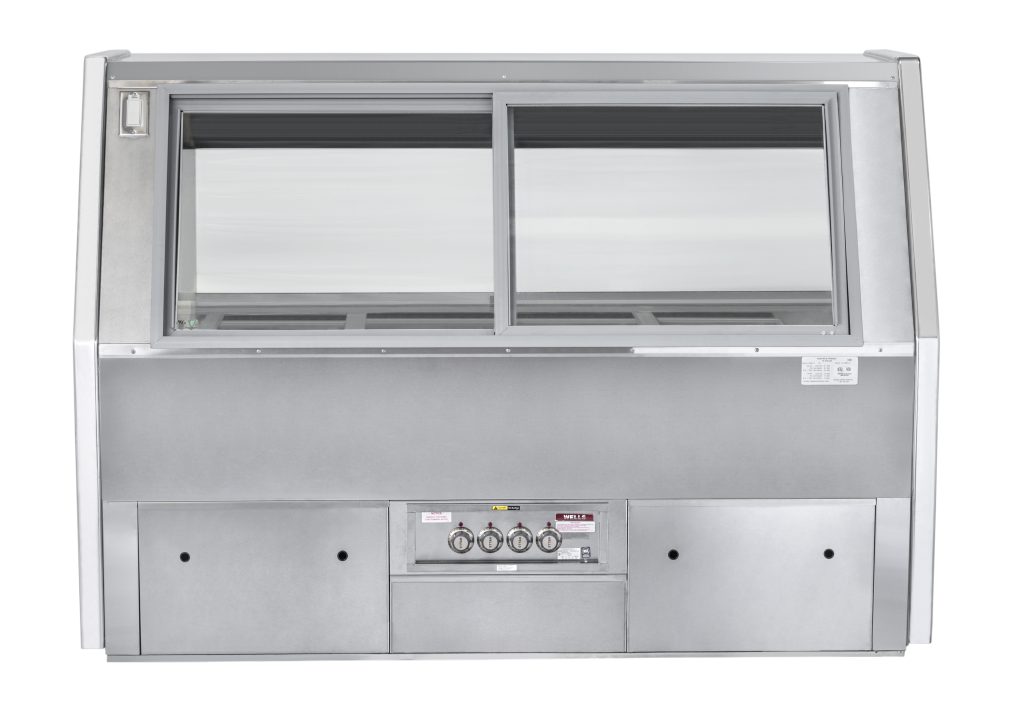 Hot Food Case, 76-1/2″W, (4) individual thermostatically controlled wells, wet or dry operation, single pane glass front, rear sliding removable double pane doors, stainless steel top, white exterior & stainless-steel interior